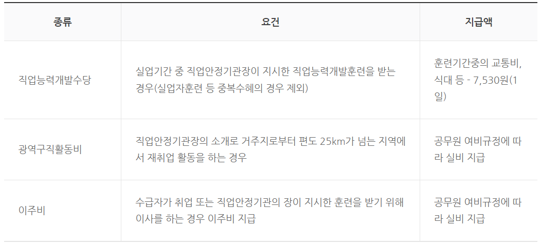 재취업을 장려하기 위해 직업능력개발수당, 광역구직활동비, 이주비 등의 취업촉진수당을 지원해 드립니다.