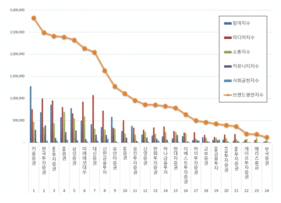 국내 증권사는 50개가 넘습니다. 미래한국 빅데이터 분석에서는 주요 24개의 증권사 브랜드를 평가하여 순위를 매겼습니다. 기준은 참여지수, 미디어지수, 소통지수, 커뮤니티지수, 사회공헌지수, 브랜드 평판 지수 입니다. 아래 순위를 참고하시어 증권사 선택에 도움이 되시길 바랍니다.